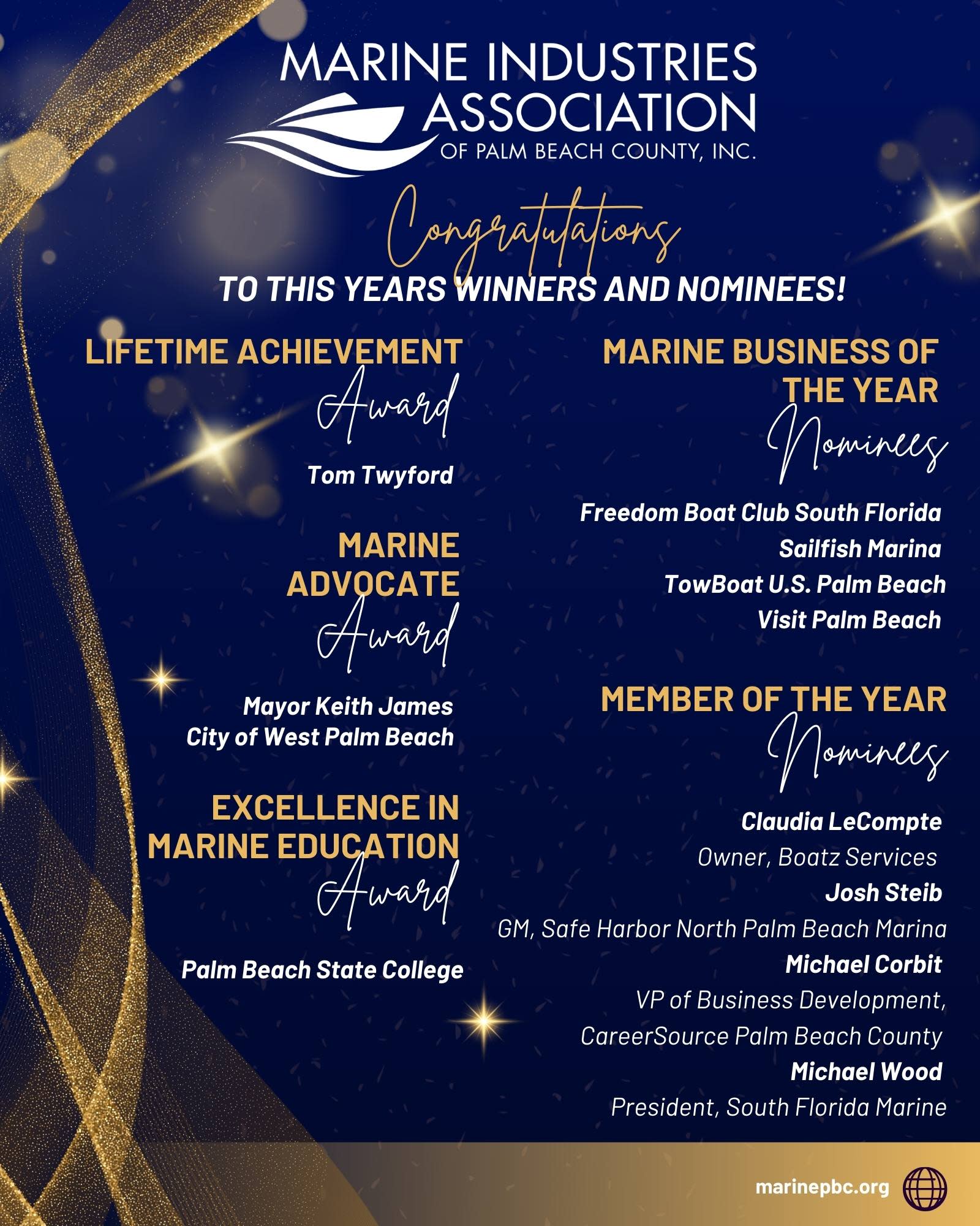 Join us for our only dinner of the year, a legislative update by Corcoran Partners, open bar (wine & beer) and awards recognizing members with 10, 20, and 30 year memberships, along with other awards. Plus a business card raffle to win two (2) Palm Beach International Boat Show Winward VIP tickets!